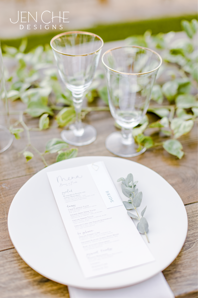 From welcome signs and ceremony programs to place cards, bar signs, and menus, let’s create a unique wedding experience that spoils your guests from beginning to end!